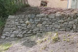 Ces moellons n’ont pas été fragilisés par le gel, pourtant faisant partie intégrante du climat dans ces zones montagneuses. Quand on regarde plus à l’arrière du mur, on remarque un dispositif drainant très important. Il est profond et s’étend verticalement sur presque l’intégralité du soutènement, entre la maçonnerie à pierre sèche et le sol. Ce mécanisme formé de petites granulométries permettait certainement en évacuant l’humidité, de limiter l’impact du gel sur les matériaux. Les vides que nous pouvons observer montrent que son rôle de filtre à particule a bien marché dans le temps puisque le sol limoneux (en dessous du sol végétal) n’est pas venu combler l’intégralité des espaces. Ces espaces amplifient la ventilation. Ce procédé sèche les pierres après les pluies et limite la propagation de l’humidité provenant du sol. La quantité de pierre montre que la ressource en matériaux est propice à des murs relativement larges, comme nous pouvons le constater par le drain. Cependant, l’utilisation des pierres n’est pas improvisée. Les gros volumes non gélifs sont placés à l’avant. Plus on va en profondeur dans le mur, plus la taille des pierres décroit. Cette diminution de calibre s’observe aussi en montant vers le couronnement. Plusieurs explications sont possibles mais nous ne pourrons pas les vérifier. En voici quelques-unes. Tout d’abord, placer des grosses pierres de blocages en bas de mur permet de supporter la charge du reste de l’ouvrage, sans fissurer, du fait de leur épaisseur. Par ailleurs, placer du cailloutis et de plus petits moellons au deux tiers du mur, permettrait une meilleure filtration des fines rapportées par le ruissellement. Ces particules resteraient ainsi bloquées au stade supérieur. Le premier tiers du mur maintiendrait principalement la poussée du sol (comme le montrent quelques fois les ventres se formant sur les anciens ouvrages de pierre sèche).