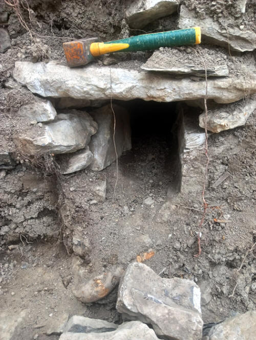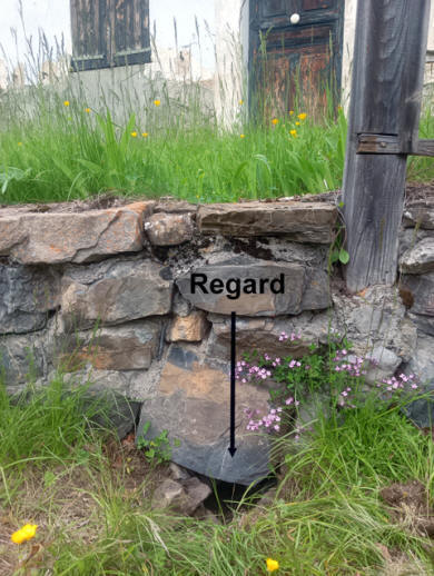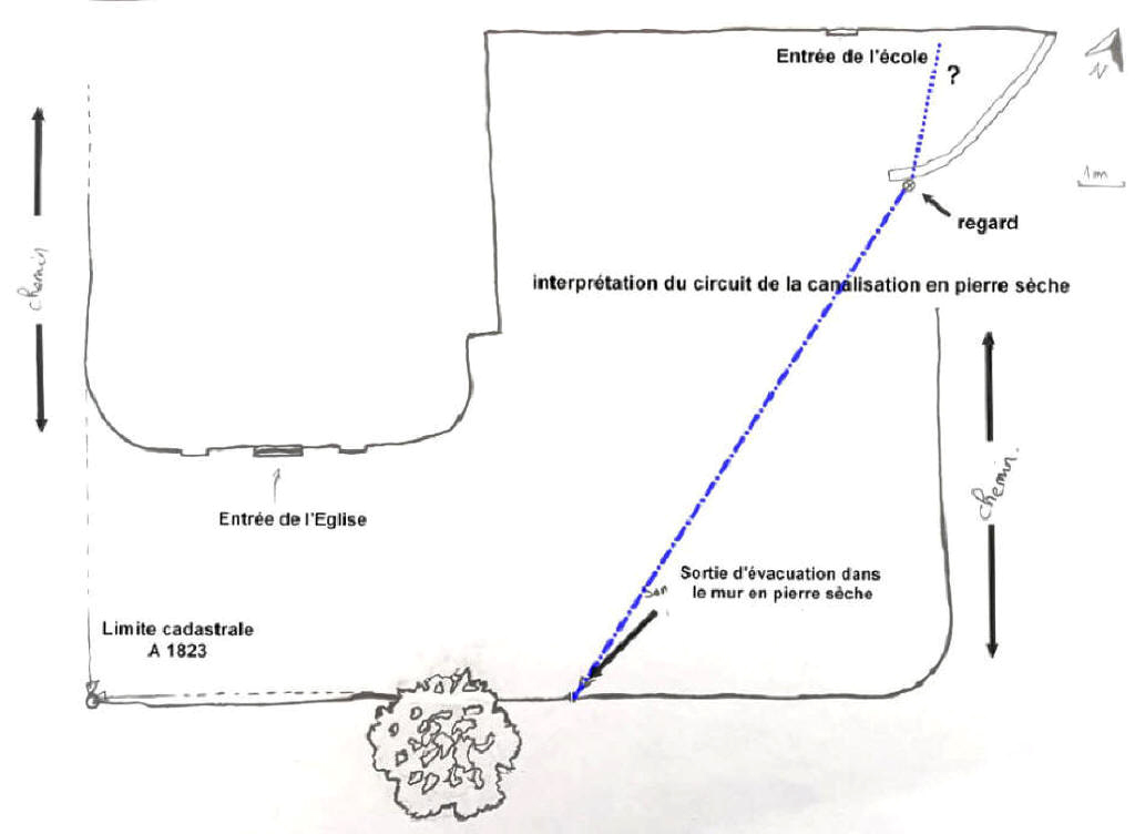 Pendant notre travail, nous avons découvert un système de canalisation souterrain en pierre sèche. Nous n’avons pas pu l’étudier car il menait à la partie mitoyenne de l’église (autrefois une école), privatisée et fermée. Je profite néanmoins de cet article pour répertorier ce système qui semble être une évacuation des eaux.