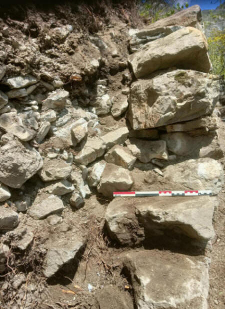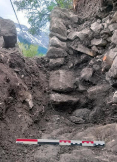 Examination of the wall revealed a well-developed drainage channel behind the masonry. Made of small stones and numerous voids, this system facilitated water drainage and internal ventilation of the structure. It thus limited the effects of frost, common in the mountains, which explains the good preservation of certain areas of the wall. The arrangement of the stones, with massive blocks at the base and increasingly finer materials towards the top and rear, follows precise mechanical and hydraulic principles.