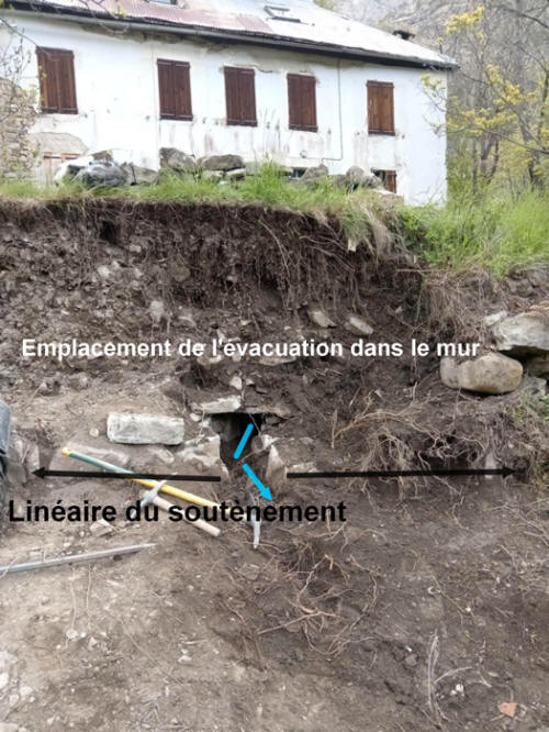 L’observation du mur a mis en évidence un drain bien développé à l’arrière de la maçonnerie. Fait de petites pierres et de nombreux vides, ce système favorisait l’évacuation de l’eau et la ventilation interne de l’ouvrage. Il limitait ainsi les effets du gel, fréquents en montagne, d'où la bonne conservation de certaines zones du mur. La répartition des pierres, avec des blocs massifs en partie basse et des matériaux de plus en plus fins vers le haut et l’arrière, répond à des logiques mécaniques et hydrauliques précises.