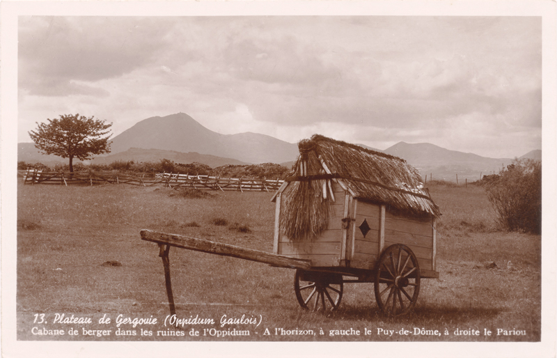 Si le cliché lui-même n'est pas antérieur à la carte postale, cela indique une utilisation tardive de ce type d'abri pastoral nocturne dans la région. On peut penser que le toit de paille est là non seulement pour protéger la cabane de la pluie mis aussi pour lui donner une meilleure isolation thermique. L'existence, en Auvergne, de cabanes mobiles pour l'accompagnement et la surveillance du troupeau, est signalée pour la région des Monts-Dore par le géographe Georges Bertrand dans son livre La Vie pastorale dans les Monts-Dore (Lyon, 1932). Le bâtier, écrit-il, avait pour guérite de nuit un lit clos, couvert de chaume, en bois ou en zinc et monté sur deux roues, un timon permettant d'y atteler des vaches pour le déplacement. Ce rare document est une photographie albuminée de la fin du XIXe siècle (c. 1880 ?). Dans un lieu qui est donné comme étant le Puy-de-Dôme, on voit un extraordinaire abri mobile de berger dont l'habitacle est non pas une caisse en bois mais une énorme ruche de paille cylindrique dont la partie supérieure, de forme arrondie, est hérissée de côtes rayonnant depuis une sorte de chignon terminal. On peut supposer que la cloche de paille repose sur une armature empêchant son affaissement. Le véhicule est une charrette à essieu fixe et deux roues et à timon axial.