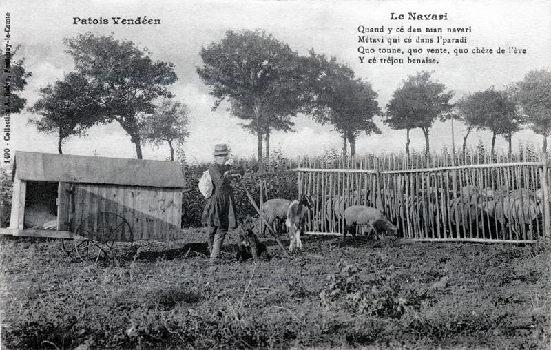 Document No 14 Le navari, ou plus exactement navarit, est « en Saintonge [un] petit abri, [une] petite baraque en bois que l'on établit dans les terres ou dans les marais pour mettre les bergers à l'abri », nous dit Marcel Lachiver dans son Dictionnaire du monde rural (1997). En fait, le terme est également attesté plus au nord, en Vendée, si l'on en croit cette carte postale de l'âge d'or. Le navari vendéen de cette carte a quelque chose en plus de la définition de Lachiver : des roues. Son aspect est tout à fait classique : une caisse rectangulaire aux parois en planches disposées verticalement et au toit en bâtière recouvert de zinc ou de toile imperméabilisée, montée sur deux roues en fer, avec une entrée latérale fermée par une porte se rabattant du côté de la roue. Il semble y avoir un timon à l'avant mais la vue est coupée.