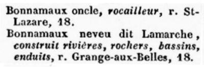 Dans les almanachs de 1833 et 1837, le nom de « Bonnamaux oncle, rocailleur, r. St-Lazare, 18 », apparaît. On constate que le neveu a changé d’adresse et que tous les deux sont rocailleurs (fig. 11).