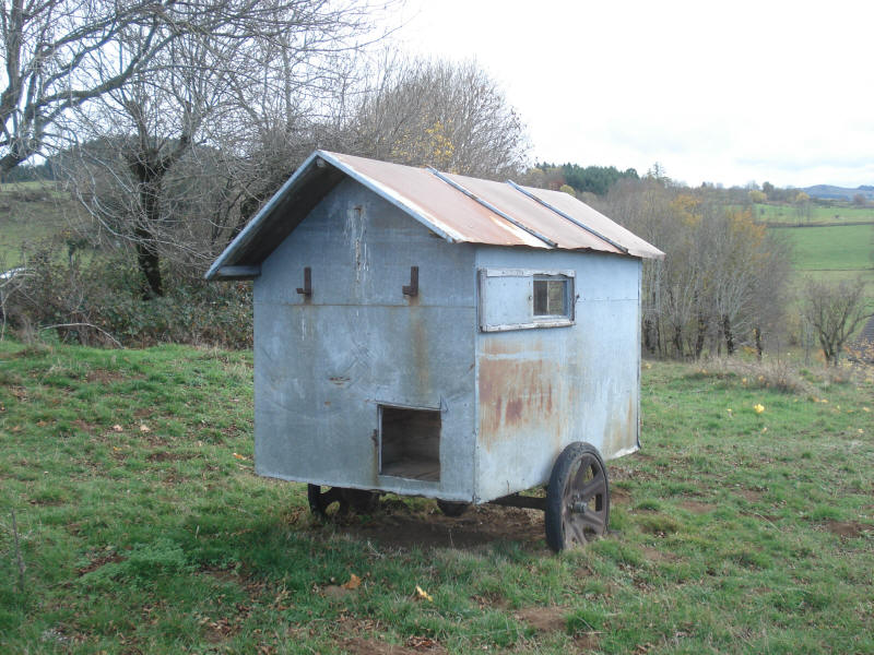 Cabane à trois roues, type triporteur Roues de bois à rayons et bandage. Simple porte maintenue ouverte calée par une boulade. Le toit est recouvert de tôle nervurée. L’attelage se fait par la droite.