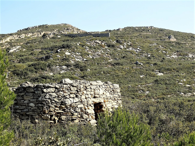 - ou d’autres encore appuyées contre une paroi rocheuse. Quelques abris sous roche ont été aménagés et protégés par des façades en pierre sèche montées en retrait du surplomb rocheux (fig. 5). Ils ont été vraisemblablement utilisés pour tirer parti de cavités existantes afin de disposer d’un abri à ne fermer qu’en partie frontale et d'éviter ainsi une construction plus complexe. Économie de moyens sans doute pour ces petits abris réduits à leur plus simple expression, mais utilitaires.