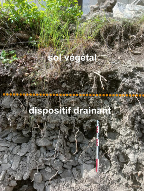 L’observation du mur a mis en évidence un drain bien développé à l’arrière de la maçonnerie. Fait de petites pierres et de nombreux vides, ce système favorisait l’évacuation de l’eau et la ventilation interne de l’ouvrage. Il limitait ainsi les effets du gel, fréquents en montagne, d'où la bonne conservation de certaines zones du mur. La répartition des pierres, avec des blocs massifs en partie basse et des matériaux de plus en plus fins vers le haut et l’arrière, répond à des logiques mécaniques et hydrauliques précises.
