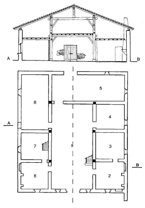 LA MAISON PROFONDE À NEF ET BAS-CÔTÉS C'est une maison à développement en profondeur (c'est-à-dire perpendiculairement à l'axe de la faîtière) dont l'ossature interne - une charpente à couples de poteaux portant ferme - délimite une nef encadrée de deux bas-côtés ou, plus rarement, d'un seul. Elle regroupe, sous un même toit, les fonctions d'habitation et d'exploitation, abritant à la fois humains, cheptel, matériel et réserves. Cette promiscuité relève d'une conception totalement opposée à celle de la ferme aux bâtiments ordonnés autour d'une cour centrale. Les maisons à nef et bas-côtés sont en fait des maisons construites pour des métayers, à l'origine par des seigneurs nobiliaires ou ecclésiastiques, ultérieurement par la bourgeoisie de robe ou marchande. Les témoins les plus anciens remontent au XVIIe siècle et les plus tardifs au XIXe. Certaines maisons de ce type ont d'abord été des granges à nef et bas-côtés relevant de domaines d'Ancien Régime, dans lesquelles un logis en dur a été aménagé au XIXe siècle. Le type se rencontre en assez grand nombre dans les Landes, le Pays Basque, en nombre moins élevé dans l'Agenais, la Charente, le bas Quercy, la Lorraine. Quelques témoins sont présents en Bourgogne, en Champagne, dans le Berry, en Périgord. Dans ces maisons, la division fonctionnelle épouse généralement la division constructive de la charpente, ainsi dans certains spécimens basques du XVIIe siècle, où des refends longitudinaux, perpendiculaires au pignon-façade et joignant les poteaux, délimitent une nef centrale à usage de remise, d'aire à battre, de vestibule (l'"eskaratza", c'est-à-dire le "carré"), et deux collatéraux, l'un pour l'habitation des humains, l'autre pour les locaux d'exploitation, le tout sous un vaste fenil-grenier. Le seul élément transversal est un cellier ou une étable ajoutée à l'arrière du bâtiment.