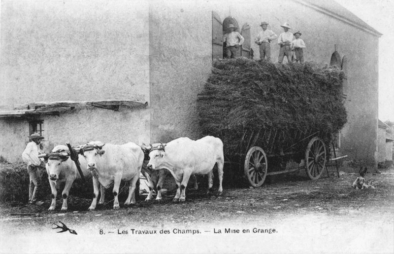 L'engrangement du foin se fait par une porte-fenêtre située au 1er étage d'un bâtiment massif qui semble tardif avec ses ouvertures en pierre de taille à arc clavé en plein cintre (XIXe siècle). Le chariot sur lequel est entassé le foin est tiré par deux paires de bœufs. |