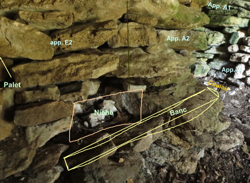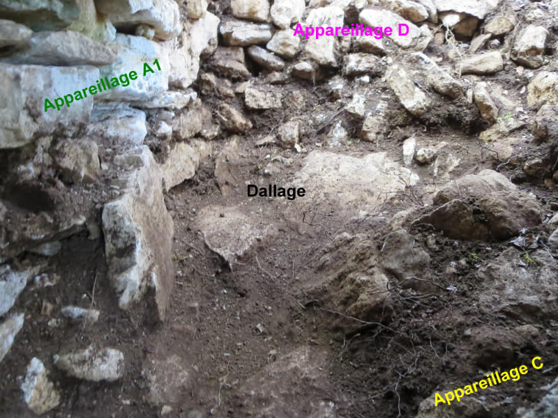 La structure A2 forme le mur opposé du couloir entre les pièces 1 et 2. Une amorce d’encorbellement est clairement lisible par le coup de sabre qu’il dessine dans le parement intérieur de la pièce 1.