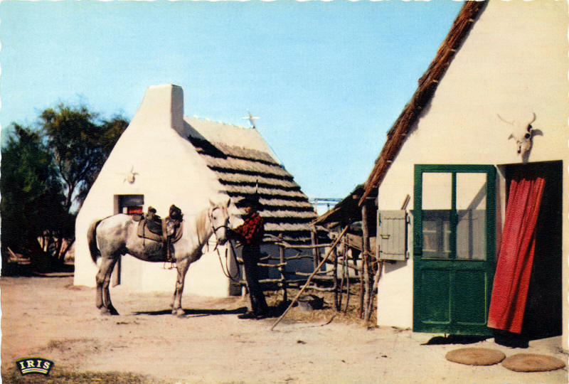 S'il est un bâtiment du mas de Cacharel qui est peu représenté sur les cartes postales, c'est bien les écuries. On aperçoit une portion de celles-ci dans cette carte postale en couleur des années 1970. Sous un vaste bâtière de sagne, à la pente bien moins marquée que celle des cabanes, on distingue l'alignement des stalles réservées aux montures. Comme ce bâtiment est bien plus grand que celui de la photo aérienne (document No 1), on doit en déduire qu'il a été reconstruit en plus grand pour accueillir davantage de chevaux.