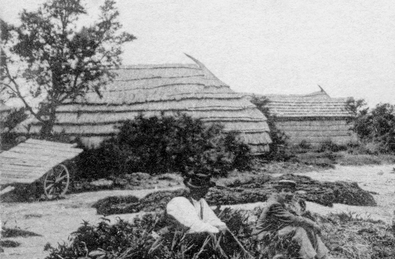 Cette vue plus rapprochée de l'édifice en montre la technique rudimentaire : en particulier, le faîtage n'est pas étanche, étant obtenu par l'affrontement des claies de couverture ultimes des versants opposés.