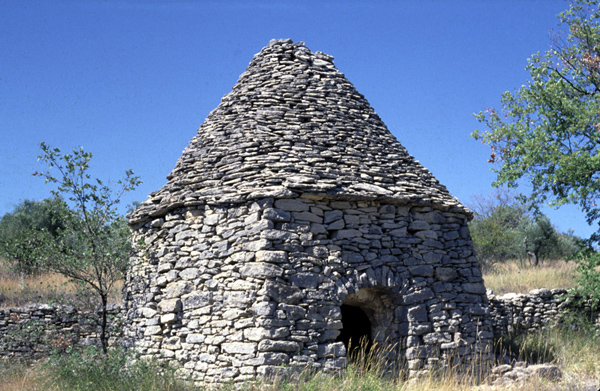 La cabane ronde, à la morphologie somme toute assez banale, présente toutefois une caractéristique qui mérite de s'y arrêter : le couvrement de l'entrée. Faute d'avoir sous la main une dalle d'une portée suffisante pour franchir la largeur de l'embrasure et d'une épaisseur adéquate pour supporter la charge de la maçonnerie supérieure, le constructeur a pris le parti de soutenir la dalle formant linteau par une grosse poutre de section carrée disposée en retrait de l'embrasure extérieure. Pour pallier la largeur insuffisante de la dalle-linteau, il a fait reposer celle-ci sur des pierres disposées en corbeau de part et d'autre de l'embrasure.
