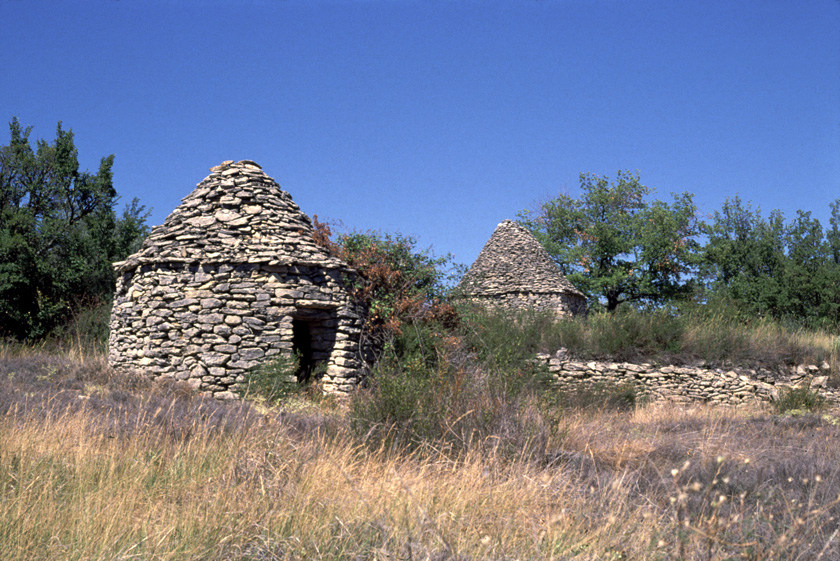 Ces deux cabanes, manifestement déjà laissées à l'abandon à l'époque, l'étaient toujours à la fin des années 1970 quand elles furent photographiées par le Nîmois Bernard Artigues, à ceci près que la végétation avait gagné du terrain et que le faîtage de la cabane ronde avait perdu le bloc de pierre qui y faisait office d'épi.