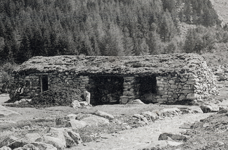 Si le tiers gauche est manifestement la partie d'habitation comme l'indiquent la porte, le fenestron et le « pâtre » assis sur son banc, en revanche la fonction exacte des deux autres tiers ne saute pas aux yeux. Le gouttereau présente, sur toute sa hauteur, deux larges ouvertures séparées par un mur de refend mais l'on n'arrive pas à distinguer ce qui se trouve à l'intérieur. Sans doute s'agit-il de la partie étable. Les grosses pierres du chaînage à l'angle du gouttereau et du pignon qui fait face au torrent ainsi que celles du refend, désignent le lit du torrent comme source principale du matériau de construction employé. Un gros tas de fumier (apparemment) s'accumule à droite de l'entrée. Les bêtes – des vaches comme on le verra plus loin – sont peut-être à l'intérieur de l'étable. Il est difficile d'en dire davantage, même avec nos moyens de grossissement actuels.