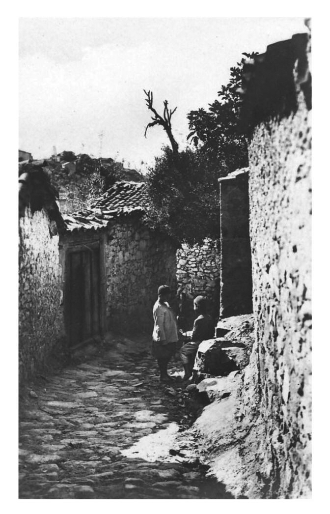 La pente abrupte du versant est coupée par un large chemin de terre surélevé. Les maisons en contrebas ont le haut de leur pignon qui dépasse à peine du niveau du sentier. En amont, entre deux maisons, débouche une ruelle pentue dont le sol est en gradins bordés de grosses pierres. Les murs des maisons des deux côtés du chemin sont blanchis à la chaux. On aperçoit, à l'arrière-plan, en bas du conglomérat de maisons étagées le long de la crête, le pignon-façage à large entrée d'une maison ouverte ou tadjmaât déjà signalée |