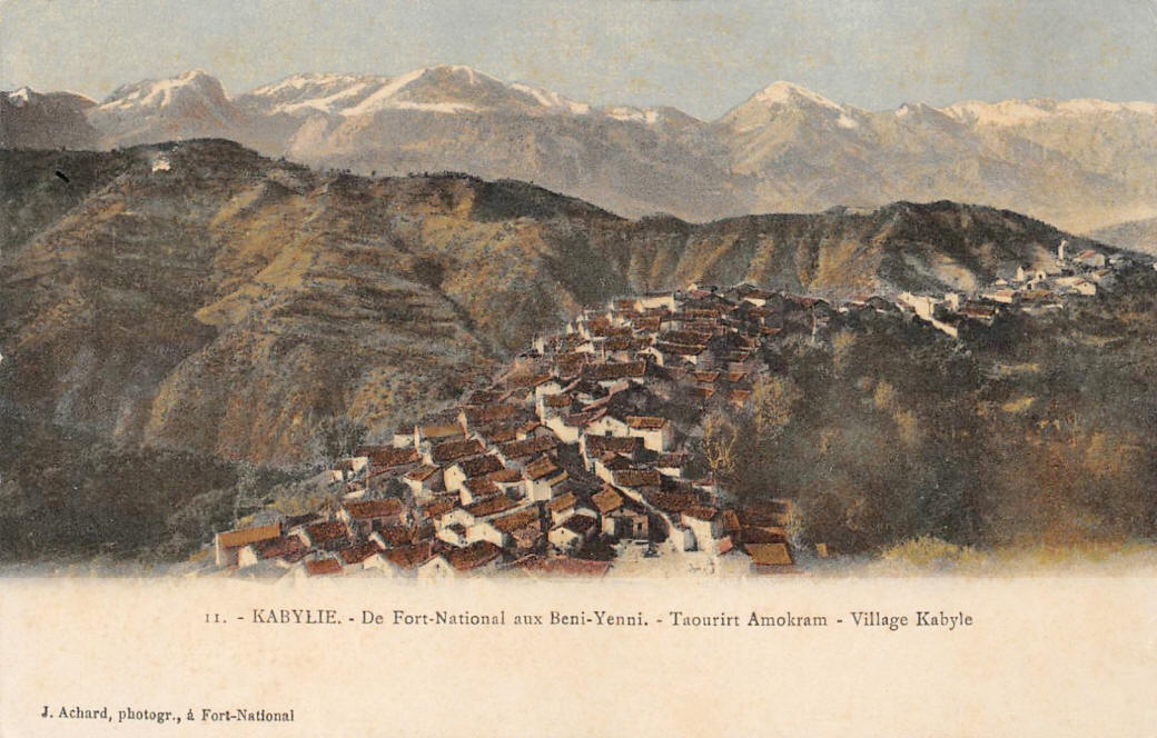 Légende sur la face illustrée, en bas et centrée : « 12. - KABYLIE. - De Fort-National aux Beni-Yenni - Taourirt Amokram - Village Kabyle ». Éditeur, mentionné dans l'angle inférieur gauche : « J. Achard, phot., Fort-National ».