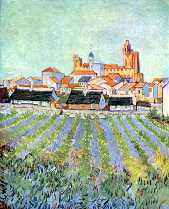 Cette étude représente le village vu depuis le sud en 1888. Église et maisons en dur à toit de tuiles creuses se dressent derrière une rangée de maisonnettes couvertes de chaume, les mêmes que celles du croquis précédent. Ces maisonnettes, qui sont non pas des cabanes de gardians mais des chaumières basses habitées par le menu peuple de l'époque, étaient construites sur l'emplacement de l'ancien rempart, dont la démolition avait été votée par la municipalité en 1857. Elles n'étaient donc pas bien vieilles lorsque van Gogh jeta son dévolu sur elles.