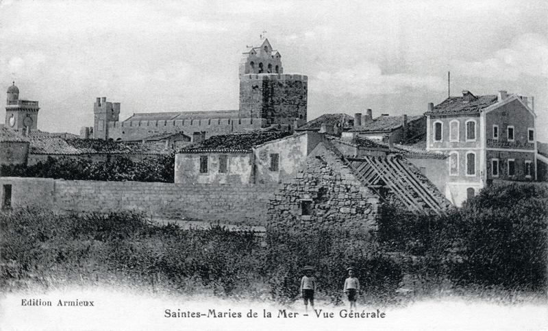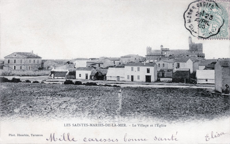 Si Les Saintes-Maries-de-la-Mer avaient conservé leurs remparts, voici ce à quoi le village aurait ressemblé vers 1900 : à Aigues-Mortes derrière ses tours et courtines. L'éditeur (sinon l'imprimeur) de cette rare et insolite carte postale ne croyait pas si bien dire en se trompant de légende !
