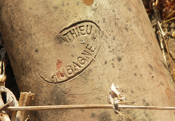 Par chance, le tesson porte un sceau assez bien conservé, portant le nom de la fabrique : Guichard Carvet & Cie et sa localisation à Marseille. J’ai recensé quelques autres débouchements ou déversoirs à travers des murs de terrasses et recourant aussi à des tuiles, mais sans trouver d’autre sceau (quand la tuile est encore bien scellé par son ciment, j’évite naturellement de tenter de la disjoindre…). Moins gourmands en énergie pour leur fabrication puisque ne demandant pas de cuisson, les tuyaux en ciment pouvaient être économiquement intéressants. Ils n’ont pourtant pas été utilisés autant que les terres cuites aubanaises. On en trouve le long du chemin de Nonza à Olcani (figure 11) au-dessus du second segment déjà étudié. Sur le même chemin, j’ai déjà signalé les quelques décamètres de rigoles jumelles en ciment et de fabrication locale.