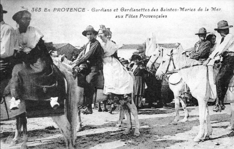 Légende en haut de la carte, le long du bord : « 365 En PROVENCE - Gardians et Gardianettes des Saintes-Maries-de-la-Mer aux Fêtes Provençales ».
