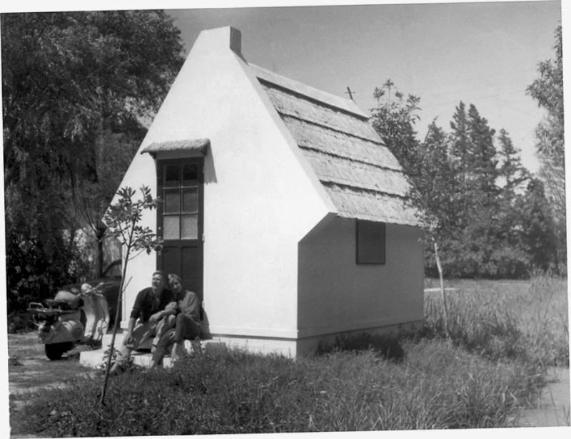 Cette carte publicitaire nous fait voir de près une de ces cabanes hôtelières du domaine de Méjanes. On dirait une châsse, un reliquaire. L'édicule repose sur un socle de béton si bien qu'un perron de deux marches précède l'entrée. Tout ce qui est en dur (socle, murs, chemise de faîte, encadrement des baies, etc.) est parfaitement rectiligne. Même les rangées de sagne tendent vers la rectilinéarité. Les jeunes gens assis sur les marches et serrés l'un contre l'autre sont là pour transmettre le message que la cabane est la retraite idéale pour un couple d'amoureux. La vespa posée sur sa béquille n'est pas sans évoquer le film Vacances romaines de William Wyler (1953) et la fameuse balade à vespa d'Audrey Hepburn et Gregory Peck. |