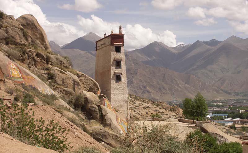 2.2 Monastère de Palcho Chode à GyantséMassif et austère, le mur à thangka du monastère de Palcho Chode se dresse en position dominante sur un versant dans l'angle nord-est de l'enceinte du monastère construite en 1425. Son érection ne serait pas antérieure aux années 1430 lorsque les thangkas monumentaux afférents furent commandités. Le mur a pour nom « gheku tower » (selon Victor Chan), « goku tramsa » (selon The Tibet Album), ou « gos sku thang sa » (selon Michael Henss, qui reprend également l'appellation de « gos sku spe'u » pour le désigner) [5].