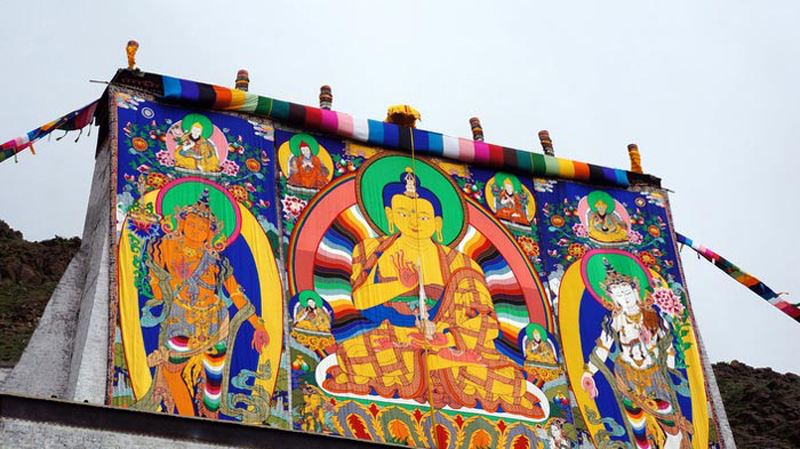 Le mur servait à exposer des représentations gigantesques de Maitreya (le Bouddha à venir), d'Amitabha (le Bouddha de la lumière infinie) et de Sakyamuni (le Bouddha éveillé), à raison d'un thangka différent par jour, lors d'une fête se déroulant du 14e au 16e jour du 5e mois lunaire tibétain (soit les 1er, 2 et 3 juillet).