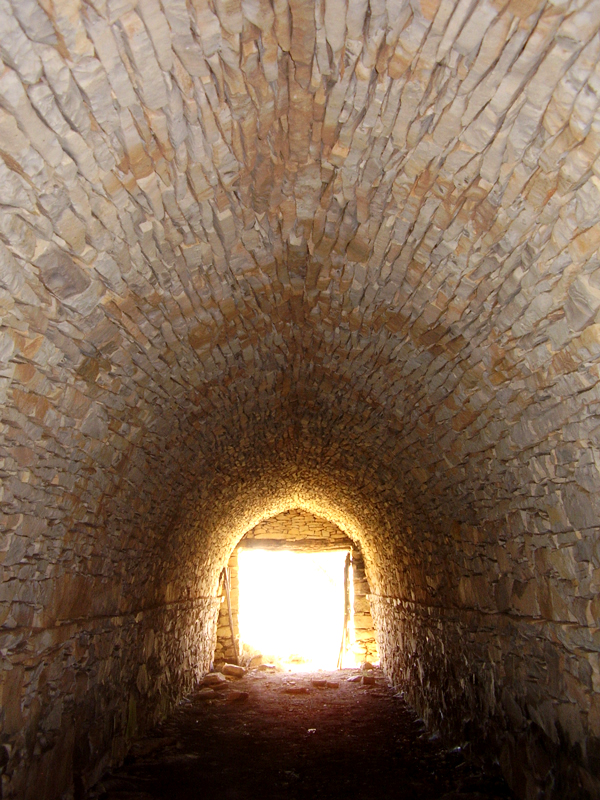 Le voûtement est formé d'un arceau médian de lauses calcaires sur lequel s'appuient deux demi-voûtes clavées faites de blocs de forme irrégulière. |