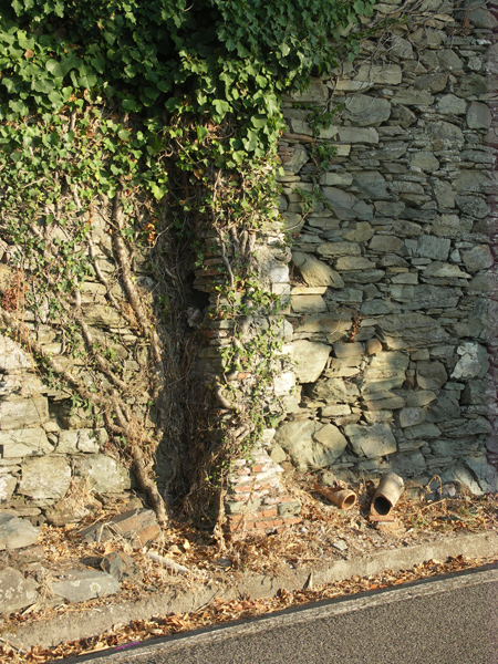Vu sa profondeur, le conduit ne pouvait venir que de l’autre côté de la route. Effectivement, quand on cherche en 2, dans le début du chemin d’Olcani, on découvre, le long du muret qui borde la rampe menant à la maison Luporsi, un canal bien pentu dont l’extrémité basse est sensiblement alignée (selon la verticale) avec une ligne de rupture dans l’édification des murs de soutènement au-dessus de la route. Peut-être en coïncidence avec la position du conduit de descente qui passait ensuite sous celle-ci ?