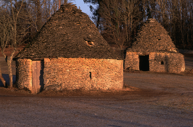 Cabanes à Meyrals (Dordogne) photographiées au lever ou au coucher du soleil. Celle à l'arrière-plan a été dépouillée de ses lauses de couverture à partir du coyau.