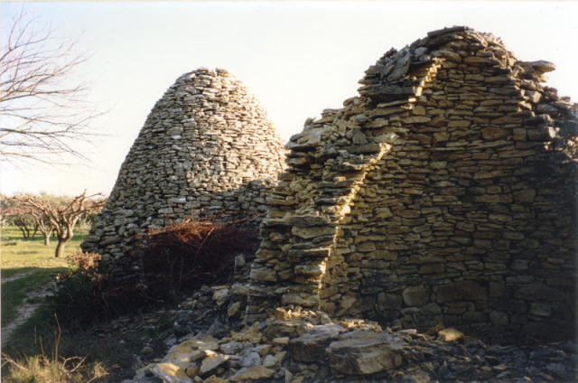 Blauzac (Gard) : deux cabanes en pierre sèche en forme d'ogive, l'une intacte, l'autre tranchée verticalement selon un de ses diamètres et servant de carrière (photo Jean Laffitte).