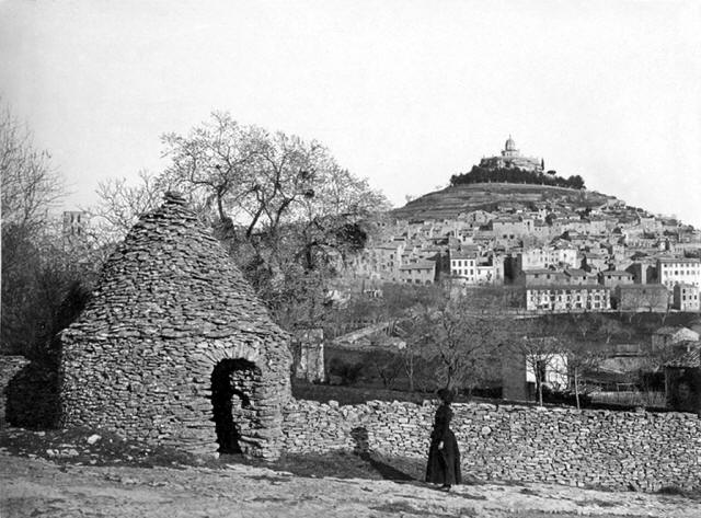 Forcalquier (Alpes-de-Haute-Provence), quartier Saint-Marc : carte postale de la première décennie du XXe siècle montrant un « cabanon pointu ». Corps de base cylindrique, entrée à arc clavé en anse de panier, toit conique de lauses avec coyau et rive légèrement saillante, pierre quillée. Devant la cabane, une possible aire à dépiquer. Photo de Saint-Marcel Eysseric, tirage argentique, 14 x 20 cm, circa 1890 (Archives départementales des Alpes-de-Haute-Provence). |