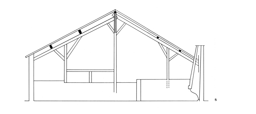 Dans cette élévation, un poteau axial porte la faîtière, dont les extrémités reposent sur les pignons. Deux arbalétriers, l’un encastré dans le gouttereau maçonné de droite, l’autre assemblé, apparemment sur un potelet plaqué contre le gouttereau de gauche, viennent s’assembler et se superposer, par enfourchement et à mi-bois, dans le haut du poteau de faîte. Chaque versant comporte une panne intermédiaire. On note une panne sablière en haut du gouttereau de gauche. Absence de contrefiches et de liens.