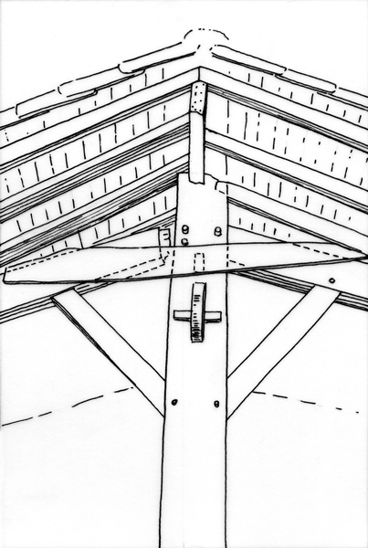 Ce dessin est censé représenter la charpente de la façade en arrière de l’auvent. La faîtière est portée par un poteau axial juché sur un dé, un lien raidissant l’angle formé par le poteau et la faîtière. Les arbalétriers, apparemment posant, en partie basse, sur la sablière des gouttereaux, s’assemblent en tête du poteau, l’un au-dessus de l’autre (le dessin ne permet pas de dire avec certitude s’il s’agit d’un assemblage par enfourchement et à mi-bois ou d’un assemblage par tenon passant dans mortaise). Chaque versant comporte une seule panne. Deux contrefiches en chevron raidissent les angles formés par le poteau et les arbalétriers. Une sous-faîtière contribue au contreventement longitudinal. Datation proposée : le XIXe siècle. No 12 - Source : BREUILLÉ Luc, DUMAS Richard, ONDET Roland, TRAPON Patrice, Maisons paysannes et vie traditionnelle en Auvergne*, en part. p. 195 (grange-étable en pisé banché au lieu dit Les Jouberts, Bulhon, Puy-de-Dôme).