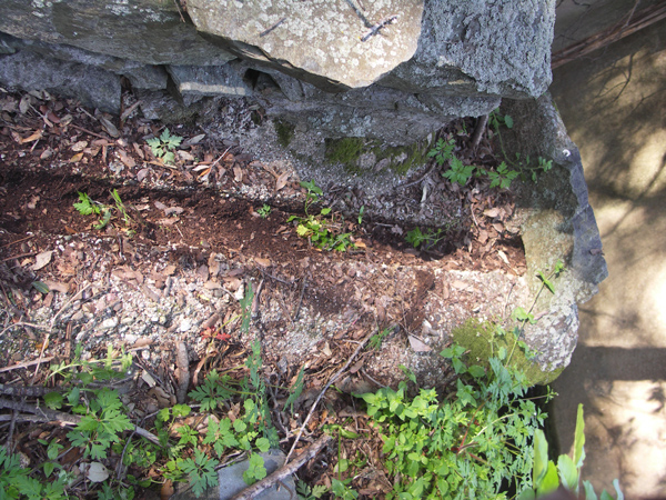 On n’en a pas fini avec les gadgets de 007. Quand on passe à l’extérieur de la paroi nord, on se trouve devant une petite structure construite au bas de ce mur (Figure 23). À première vue on la prendrait pour un banc. Quand on regarde en dessous, dans les deux logettes on trouve des conduits qui suivent le bas de la paroi du réservoir à travers le pilier du milieu et celui de droite. Probablement alimentés par un conduit venant du fond de la cuve, ils pouvaient diriger de l’eau vers une rigole partant vers l’ouest et la terrasse inférieure. Mais dont je n’ai pas trouvé trace…