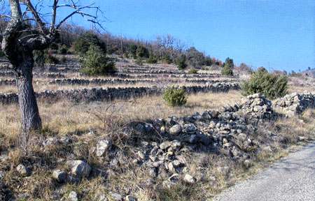 Construction d’encaissements et de murs de soutènement sur les versants Une technique différente, mais visant également à la conquête de terres de culture, est attribuée aux mêmes habitants des Cévennes par les auteurs de la Topographie de la France : « L'industrie des habitants des Cévennes est au moins aussi étonnante lorsqu'ils s'occupent de fertiliser le flanc d'une montagne calcaire. Presque partout, ces montages sont formées par des couches de pierre d'environ un demi-mètre d'épaisseur. Ces diverses assises font retraite l'une sur l'autre dans le sens de l'inclinaison de la montagne; mais l'agriculteur donne à tous ces échelons ou plateaux une largeur égale, en brisant la pierre dont il emploie les débris à construire un petit mur sur le rebord du plateau lui-même; il remplit ensuite cet encaissement d'une couche de terre végétale qu'il prend dans les fentes du rocher, ou qu'il transporte sur son dos du pied même de la montagne où les eaux l'ont peu à peu entraînée; ainsi, après un travail opiniâtre, le flanc de la montagne se trouve hérissé de petits murs parallèles qui encaissent des couches de terre végétale d'un à trois mètres de largeur. »