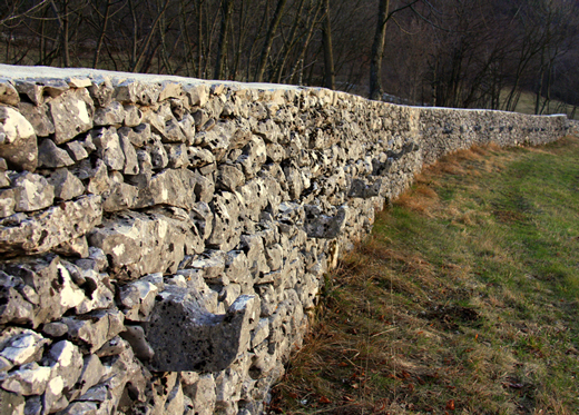 Cornes de pierre Dans le Karst classique tant à l'est de Trieste en Italie qu'en Slovénie frontalière, nous avons eu l'occasion d'observer des pierres en forme de corne, fichées dans des murs de soutènement de terrasses à treilles (1). Ces murs à cornes sont ce qui reste d'anciennes treilles de vigne. Entre ces cornes, étaient jetées des gaules (2) servant de support horizontal aux pampres (2) de ceps de vigne plantés contre le mur. L'emploi de cornes en pierre évitait d'avoir à encastrer dans le mur le bout des perches perpendiculaires à celui-ci : ainsi, il pourrissait moins vite.